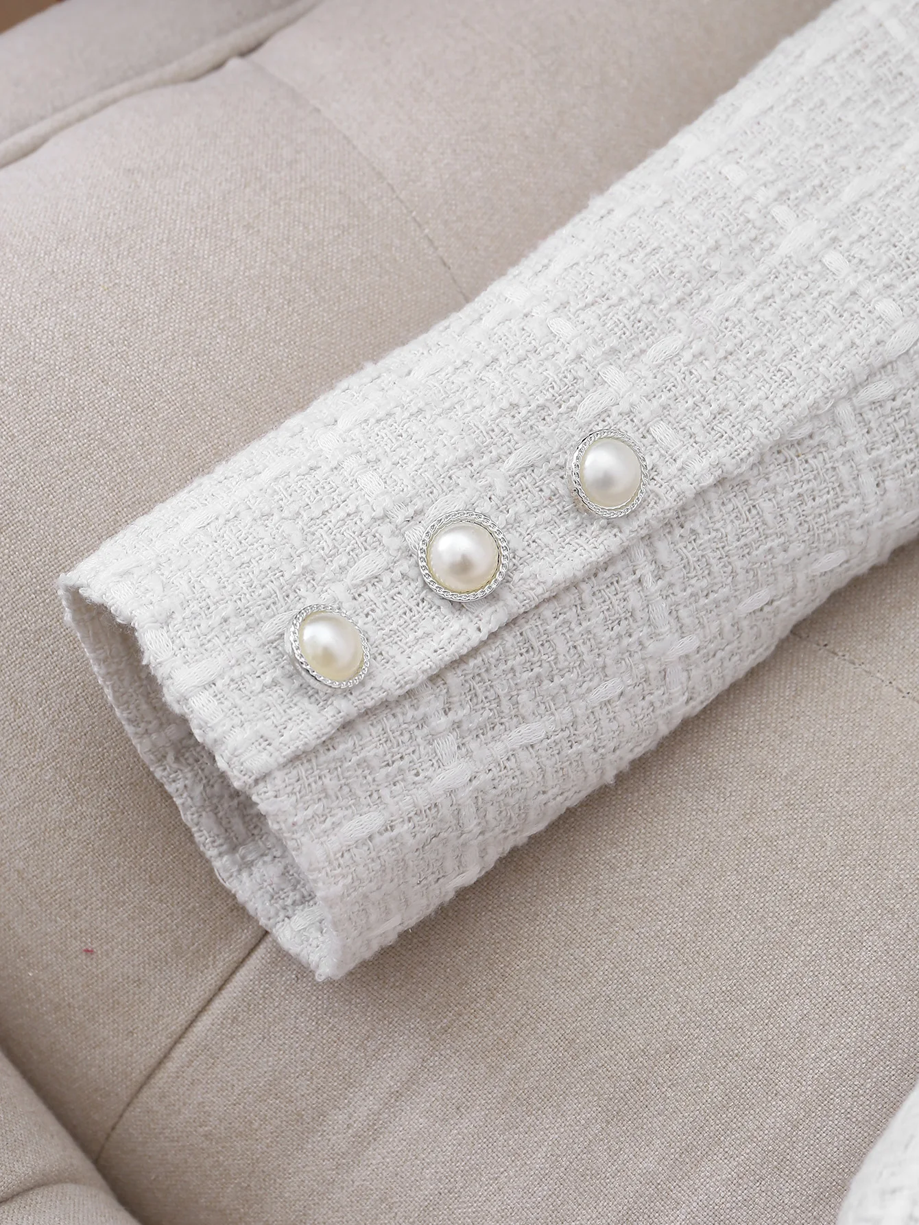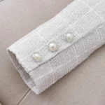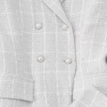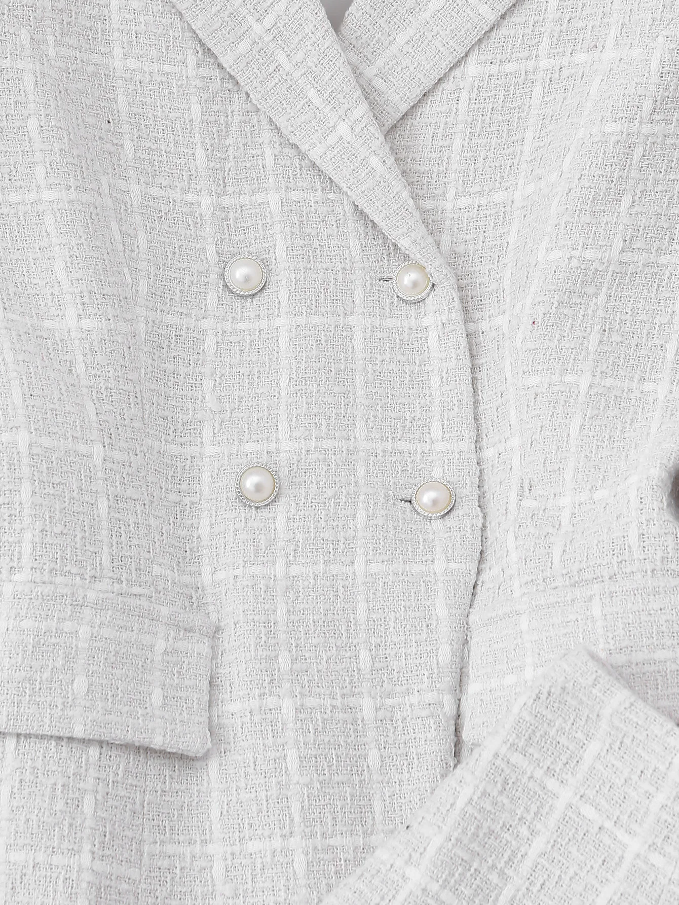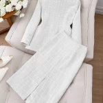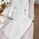 This solid white skirt suit is crafted from soft synthetic fibers with a tat weave, offering structure and comfort for cooler seasons. Featuring a double-breasted blazer with decorative buttons and a full front opening, it’s tailored for a regular fit that flatters without restricting. Designed as refined workwear, this elegant two-piece set blends professionalism with timeless style—perfect for autumn and winter occasions.